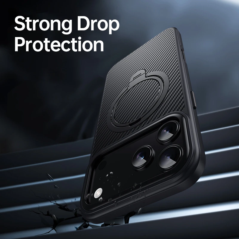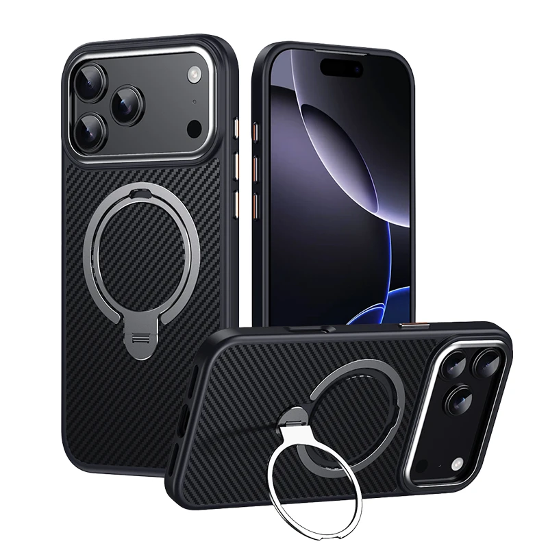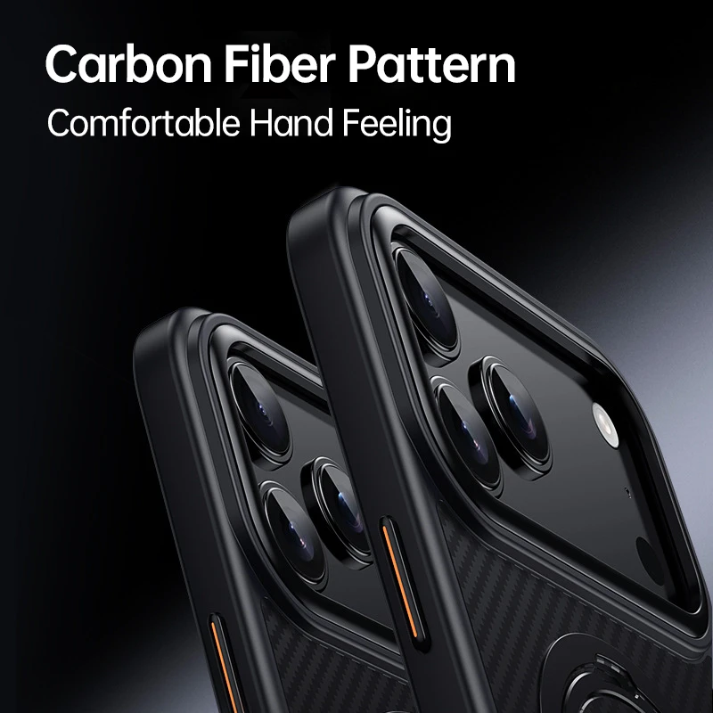 Fine detailing with a carbon fiber pattern and flush ring integration. Designed not just as protection but as a refined accessory piece.